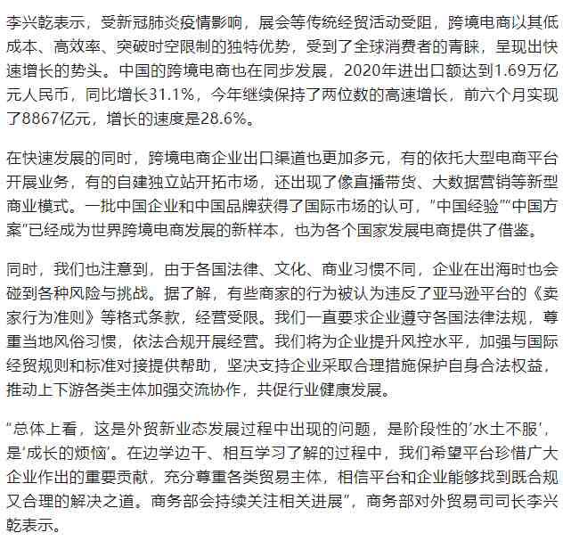 卖家还是要注意千万别忽视亚马逊平台规则,7月22日下午,针对亚马逊卖家遭封号事件,商务部对外贸易司司长李兴乾在国新办新闻发布会上就如何对待亚马逊对卖家封号行为作出回应: