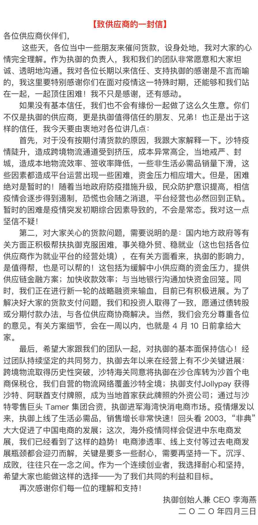 关于拖欠货款,他的解释是因为沙特疫情严重,造成跨境物流通道受到挤压,成本增加,同时一些非生活必需品销量下滑,这些因素都造成了平台运营困难,资金压力相应增大。