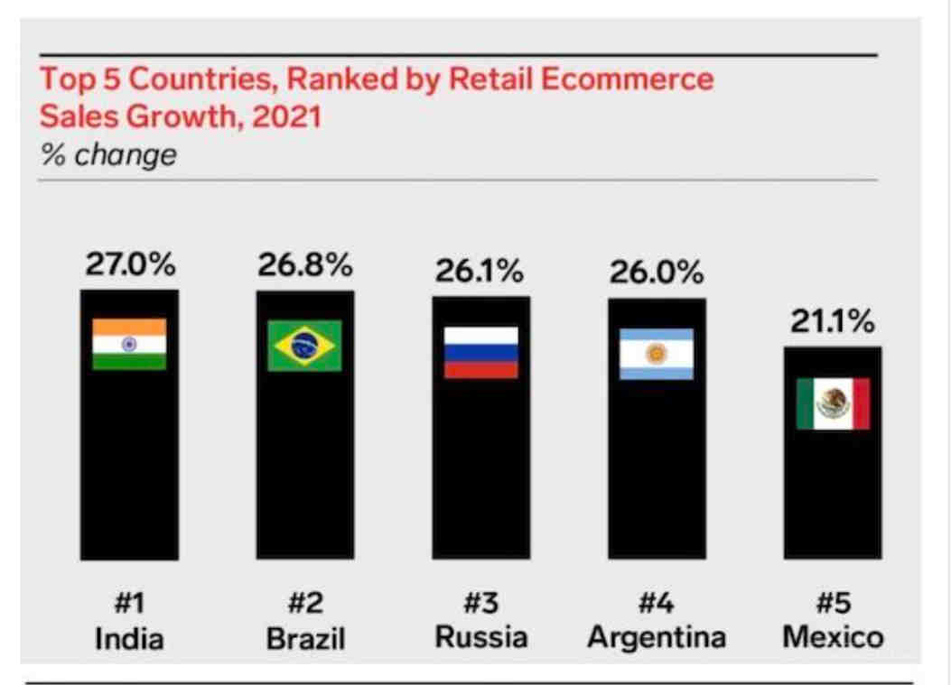 eMarketer预测2021年拉丁美洲将继续保持其在全球电商市场规模增速最快的位置,增长率高达25.6%,发展空间极大。如下图所示:今年巴西、阿根廷和墨西哥也在全球零售电商销售份额前五强中占有一席之地,其电商销售额分别占零售总额的26.8%、26.0%和21.1%。五强中占有三强的强势发展趋势,让人不禁感叹未来几年拉美地区的电商市场将突破新规模。