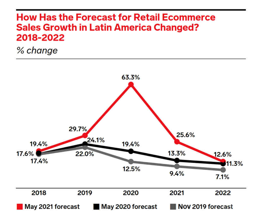 eMarketer表示,这两年拉美地区电商普及率攀高的部分原因是自 2020 年 3 月以来巴西的圣保罗和阿根廷的布宜诺斯艾利斯地区一直处于政府的长时间封锁阶段,线上购物需求因此大增。