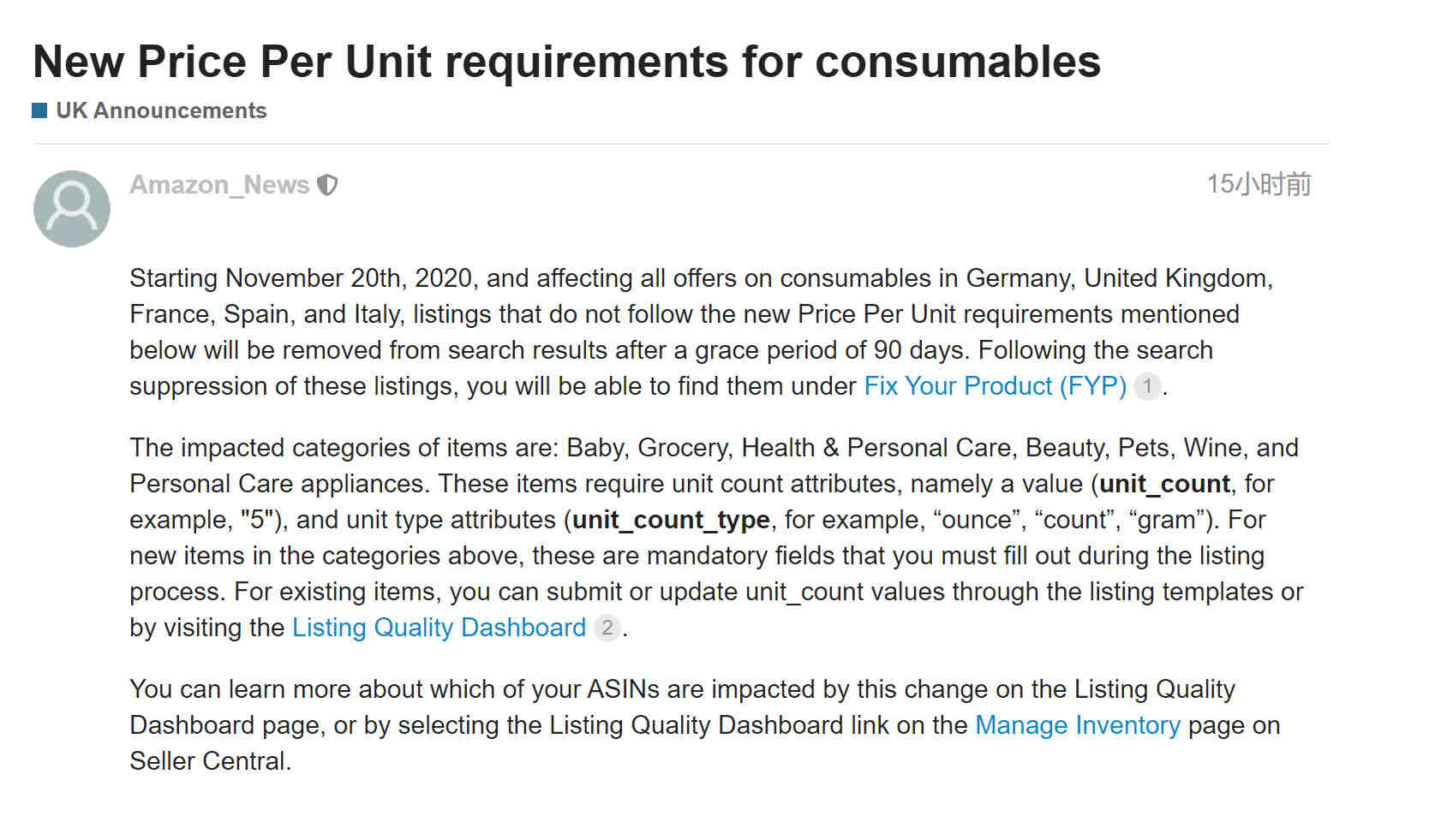 不符合上述报价新要求的产品将在 90天宽限期后从搜索结果中删除。如产品被删除您可在“ Fix Your Product“(修复您的产品)下找到它们。亚马逊建议您在产品上架报价过程中填写以上必填字段。对于现有的产品,您可以通过“listing templates”(上架模板)或访问 “Listing Quality Dashboard ”(上架质量仪表盘)提交或更新计数单位属性和类型单位属性值。