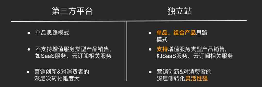 - 丰富的结构和功能、灵活的营销形式让单品、组合产品模式都能更好地在独立站上呈现,为消费者展示多维度的产品特点和定制化的消费体验- 支付灵活多样,再加上与 APP 之间的联通,使得独立站能够支持增值服务类型产品的销售,如云付费订阅产品、SaaS 服务产品- 通过对用户运营、活动运营的大数据分析,反映到如何持续优化现有策略,独立站能够提供用户和活动全链路的数据反馈;通过多样的营销工具能支持对用户的定制化营销追踪