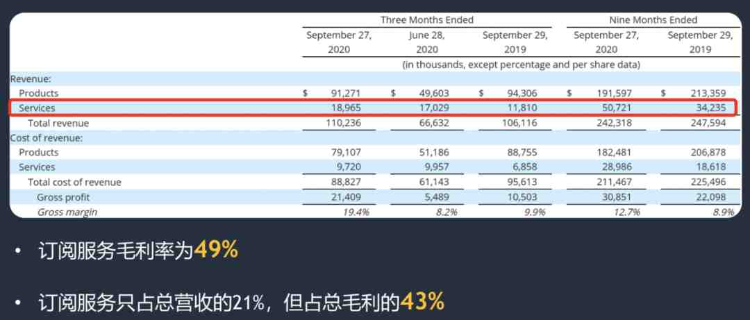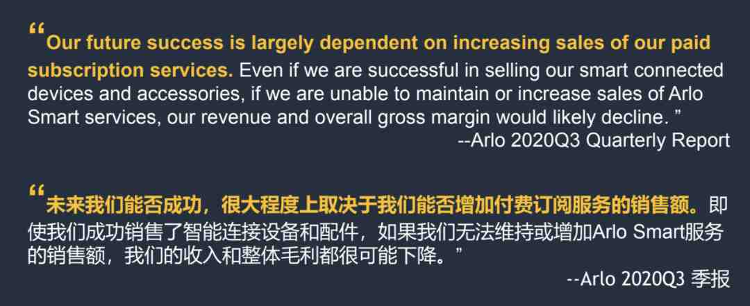 (Arlo 的 Smart Premier 和 Smart Elite 两个不同订阅套餐下对应的云录制分辨率上限不同)这样的产品结构会直接影响到商业模式和利润。Arlo 2020年 Q3 的季报中提到:付费订阅服务的增收对他们的收入和整体毛利有非常大的影响,云订阅服务虽然只占总营收的21%,但占总毛利的43%。因此在维持硬件产品销售的同时,维持或者增加付费订阅服务的销售是 Arlo 运营团队需要面临的重要命题。