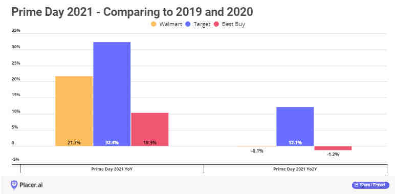 据Placer.ai最新数据,与2020年的10月Prime会员日相比,沃尔玛、Target和百思买的访问量分别增长了 21.7%、32.3% 和 10.3%。