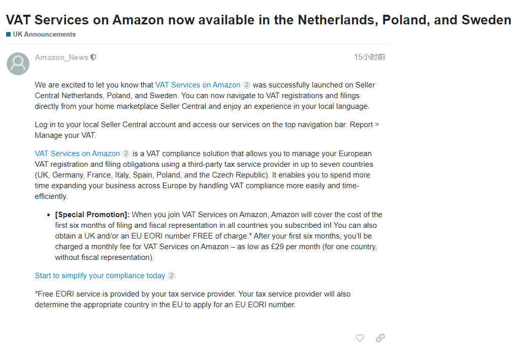 卖方通获悉,日前亚马逊欧洲站发布公告称,亚马逊增值税服务现已在荷兰、波兰和瑞典站卖家中心推出。卖家可直接从本地市场卖家中心进行增值税注册申报,并切换当地语言。