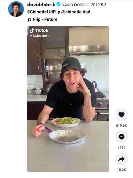 与此同时,为了推广这一话题标签的使用,让尽可能多的人参与挑战,该品牌还联系了自称是Chipotle“粉丝”的Z世代影响者,比如Youtube用户David Dobrik(在Youtube上拥有1820万订户),以开展这项活动。他的视频发布在TikTok上,短短几天内就获得了60多万个赞、1700条评论和1.5万多次分享。