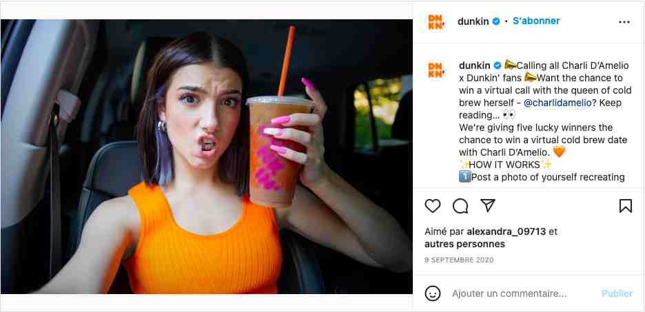 Charli发布的视频获得了超过470万个赞,53K评论和144K分享。该品牌还在其Instagram账户上发布了一场比赛,允许5名粉丝赢得与TikToker的视频会面。如何获得呢?用户发布一张自己与“The Charli”的照片,并tag标签#CharliXDunkinContest,再提及该品牌。