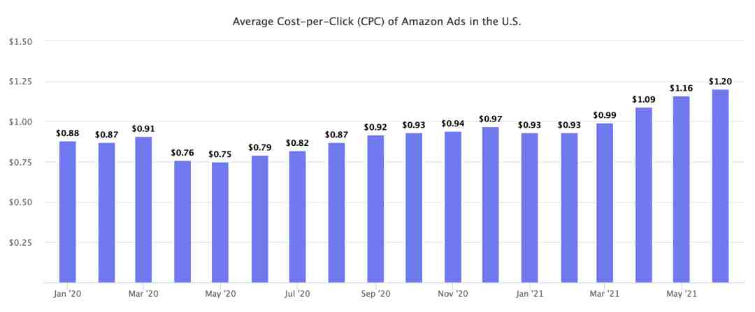 想必各位老铁今年都有一个比较深的体会,就是广告费水涨船高,那么究竟升了多少呢?根据Marketplace Pulse研究发现,截止6月9日,亚马逊广告的CPC(平均每次点击费用)上升至 1.20美元。较今年年初的0.93美元上涨了30%,较去年同期上涨超过50%。