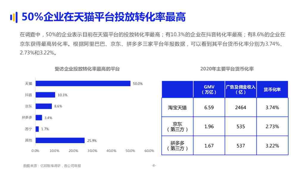 除了亮眼的商家参与数据之外,天猫的地位也获得不少行业机构认可。根据亿邦智库日前发布的《2021品牌企业618大促洞察报告》显示,天猫在参与调研的品牌商家投放转化率满意度平台排名中位居第一,高出第二名近40个百分点。有80%的受访企业参与天猫活动,参与天猫活动的品牌企业中有半数以上将年中大促预算的30%以上留给天猫。