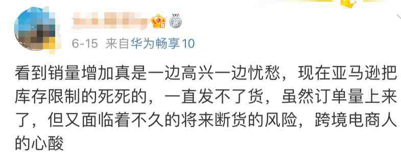 但是,随着销量增加,这些卖家的烦恼也接踵而至。“看到销量增加真是一边高兴一边忧愁,现在亚马逊把库存限制得死死的,一直发不了货,虽然订单量上来了,但又面临着将来不久的断货风险。”有卖家这样说到。