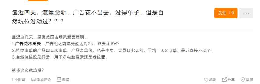 通常来说,大促前,大多数卖家的订单现状其实并不尽如人意,有卖家在论坛发帖吐槽:最近四天,流量腰斩,广告花不出去,没单子,但是自然坑位根本没动过。