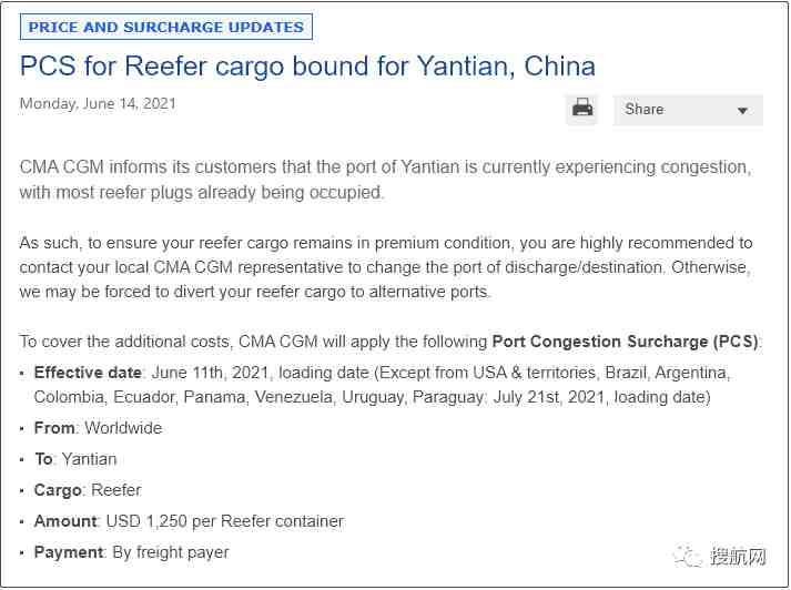 CMA CGM在公告中通知其客户,盐田港目前大部分冷藏箱插头已被占用。因此,为确保您的冷藏货物保持优质状态,强烈建议您联系当地的CMA CGM代表以更改卸货港/目的地。否则,我们可能会被迫将您的冷藏货物转移到其他港口。为了支付额外费用,CMA CGM将于2021年6月11日(装船日)起所有至盐田港的冷藏箱收取1250美元的拥堵附加费(PCS)。