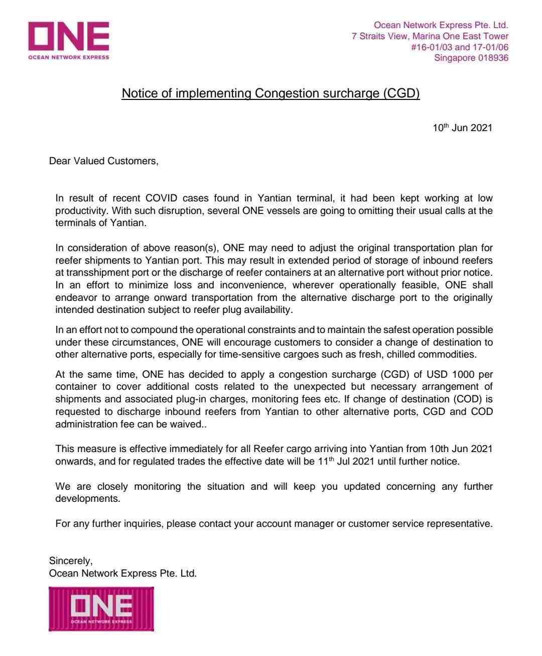 与此同时,ONE决定对每个集装箱征收1000美元的拥挤附加费,以支付因意外但必要的运输安排以及相关的插头费用、监控费用等所产生的额外费用。如要求更改目的港(COD)将入港冷藏箱从盐田卸至其他替代港口,可免除CGD和COD管理费。