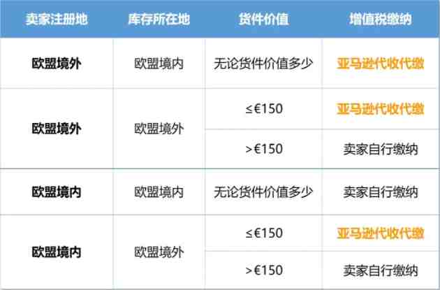 卖家注册地在欧盟境内时,只有卖家库存所在地在欧盟境外,且货件价值不高于150欧元时,亚马逊才会代收代缴VAT,其余情况皆由卖家自行缴纳。