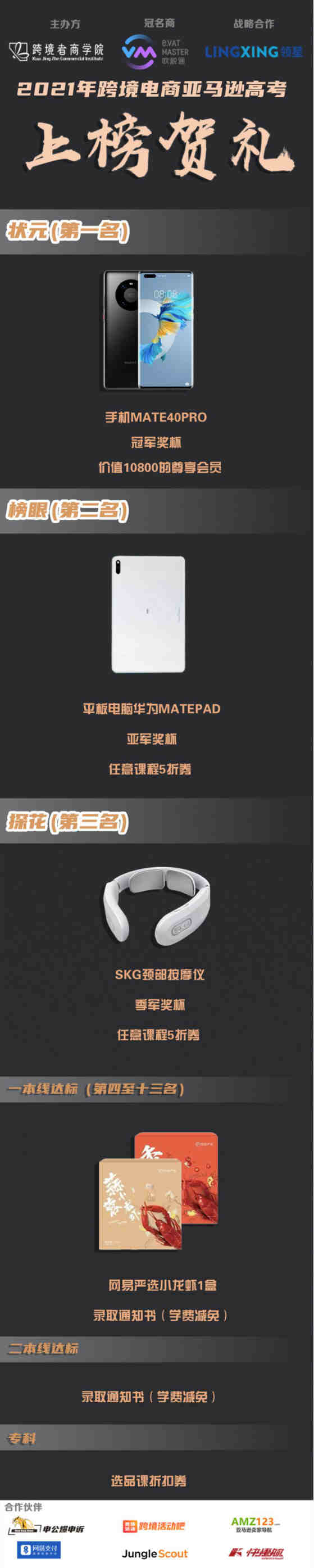借着今天高考这个时机,我们准备了一份“跨境电商亚马逊高考(全国卷)”,帮亚马逊卖家也一起参与到今天的高考盛事之中!我们还设置了状元、榜眼、探花(前三名)以及一本线、二本线和专科线一共六档奖励!包括最新的华为Mate40 Pro!