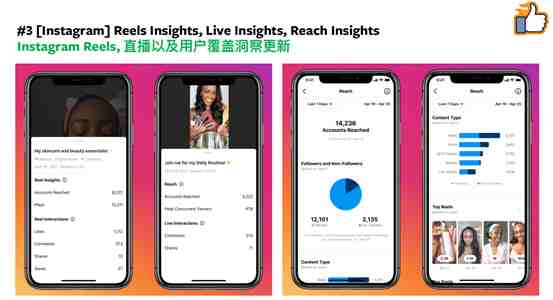 自6月1日起,Facebook已经推出IG应用内洞察产品的多项更新;包括reels、live直播、新的用户触及insights和更新版本的使用页面: