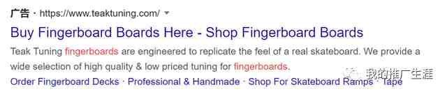 我在谷歌搜素fingerboard关键词,可以看到下面三个网站投放了广告,着陆页都是网站的首页,因为fingerboard本身是一个大词,用户具有目标不确定性,还处于营销漏斗的顶端位置,所以需要提供fingerboard以及周边的产品来提供给用户进行选择。