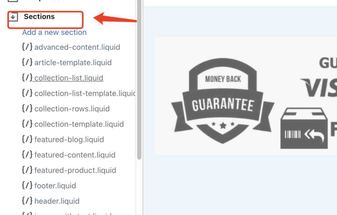 接下来要修改代码,我们先进入Sections(产品页面代码)