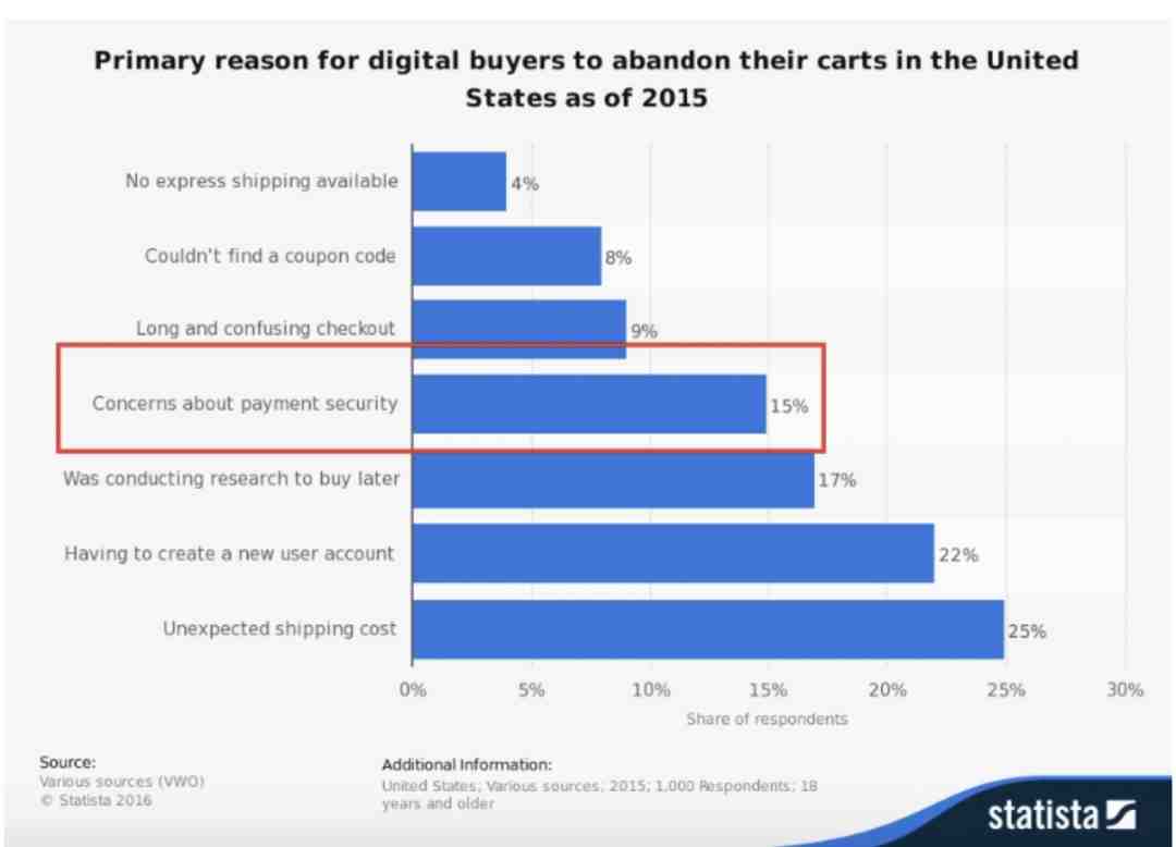 有数据显示,电商运营中平均有75%左右的销售额是因为弃购而流失。在2015年Statista的调查发现15%左右的销售额流失是因为买家对网站支付安全的担忧。到了2017年,这个比例上升到19%。这就表明买家越来越重视安全支付这个问题。