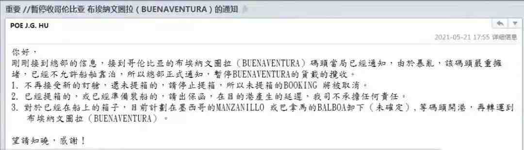 根据哥伦比亚媒体Transborder C.H. Robinson Worldwide称,当地马士基,地中海航运公司(MSC),CMA CGM,长荣海运,中远海运,汉堡南美和其他公司已暂停运营。