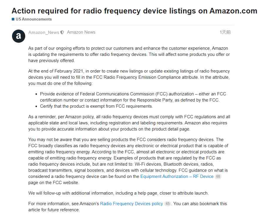 亚马逊官方发布公告,告知卖家对于含有射频设备产品的上架有了新的规定和要求。详情如下: