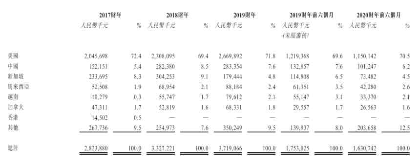 美国是汇森家居的主要出口国,2020年前六个月贡献约70.5%的收益。沃尔玛是汇森家居家具产品的主要客户之一,并是沃尔玛在中国唯一板式家具直接供货商。沃尔玛于2017财年、2018财年、2019财年及2020财年前六个月分别贡献了汇森约19.8%、22%、23.9%及25.3%的收入。