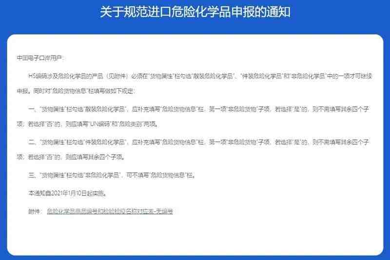 2020年12月24日,单一窗口发布关于规范进口危险化学品申报的通知,自2021年1月10日起,HS编码涉及危险化学品的产品必须在“货物属性”栏勾选“散装危险化学品”、“件装危险化学品”和“非危险化学品”中的一项才可继续申报。同时对“危险货物信息”栏填写进行规定