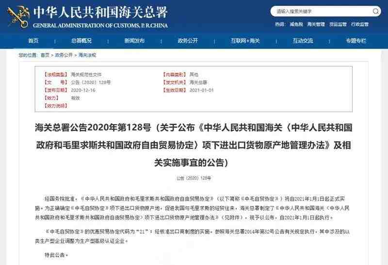 12月18日,海关总署发布2020年第128号公告,公布中国和毛里求斯自由贸易协定项下进出口货物原产地管理办法,并于2021年1月1日起正式实施