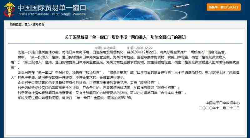 2020年12月22日,单一窗口再发布通知,自2020年12月22日,海关总署全面推广“两段准入”信息化监管。其中,“第一段准入”是指,进口货物提离口岸海关监管区前,海关对有检疫、查验等要求的货物,实施口岸检查,确定“是否允许货物入境”;“第二段准入”是指,进口货物提离口岸海关监管区后,海关对有检验要求的货物,实施目的地检查,确定“是否允许货物进入国内市场销售或使用”