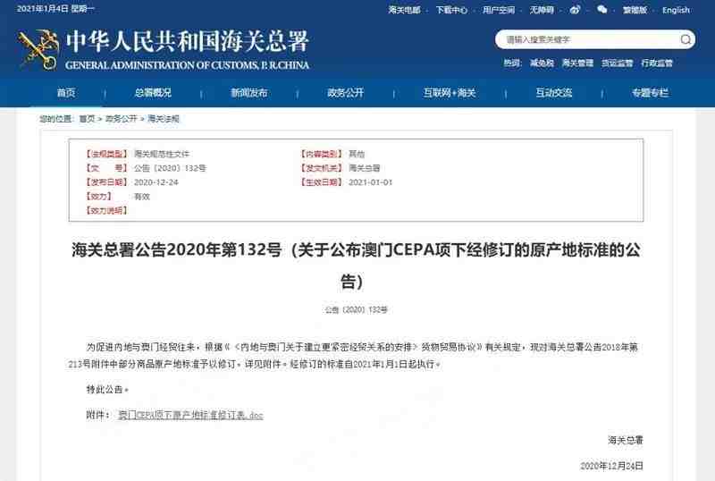 根据海关总署2020年12月24日发布的公告:为促进内地与澳门经贸往来,根据《〈内地与澳门关于建立更紧密经贸关系的安排〉货物贸易协议》有关规定,现对海关总署公告2018年第213号附件中部分商品原产地标准予以修订,详见公告中的附件。经修订的标准自2021年1月1日起执行