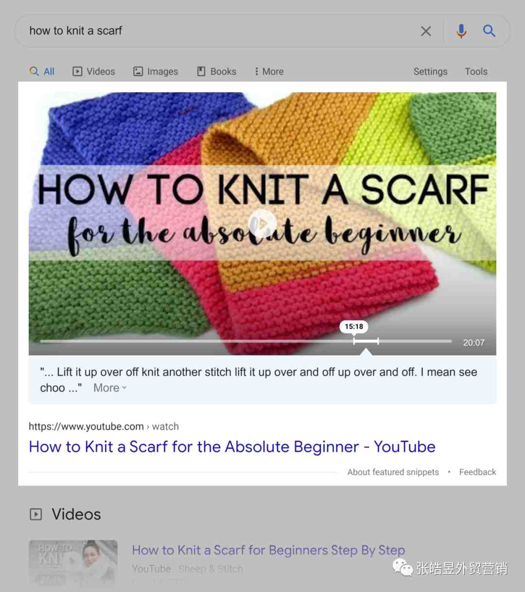 就像下面图片演示的,当我们搜索How to knit a scarf的时候,排在SERP首位的是Youtube视频。