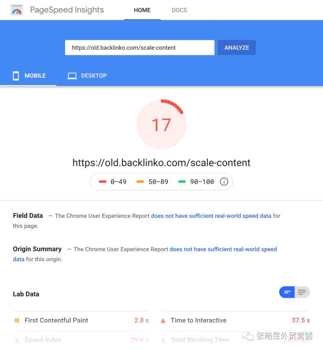 Brian Dean自己网站Backlinko.com在page speed insight得分很低,尤其是在移动端的分数,只有17分。