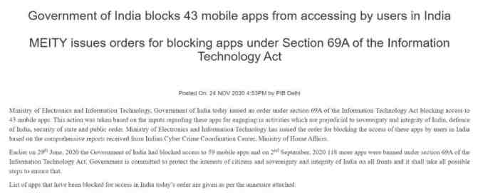 据印度电子和信息技术部在公告中声称,根据印度内政部网络犯罪协调中心的一份“综合报告”,他们认为这43款应用“从事危害印度领土主权、防务事业、国家安全和公共秩序的活动”,因此下令封禁这批应用。