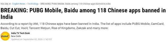 9月2日,印度政府又一次宣布禁用118款中国APP,这次的封杀范围包括了搜索引擎百度、视频应用优酷、腾讯旗下的热门游戏绝地求生和社交软件微信及企业微信等。