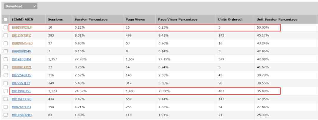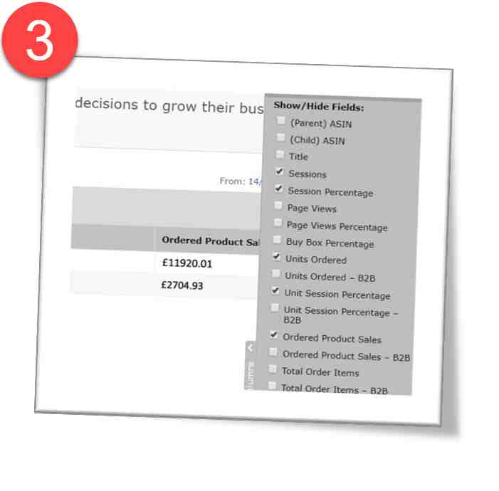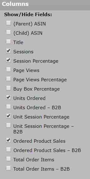 然后在列的右侧您需要选择:Sessions, Session Percentage, Units Ordered, Unit Session Percentage, Ordered Products Sales。