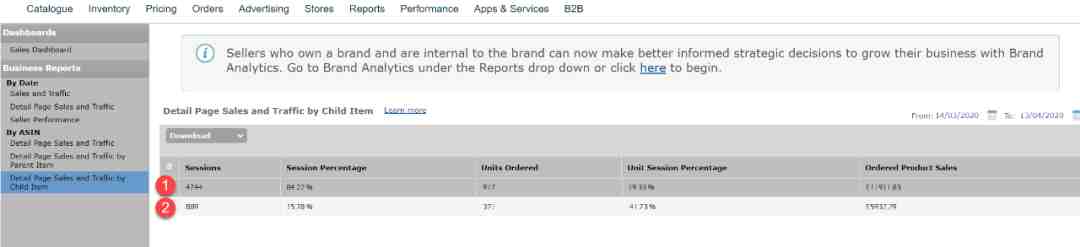 首先,您需要转到销售者中心->报告->商业报告,然后单击“按子项目细化页面销售和流量”。