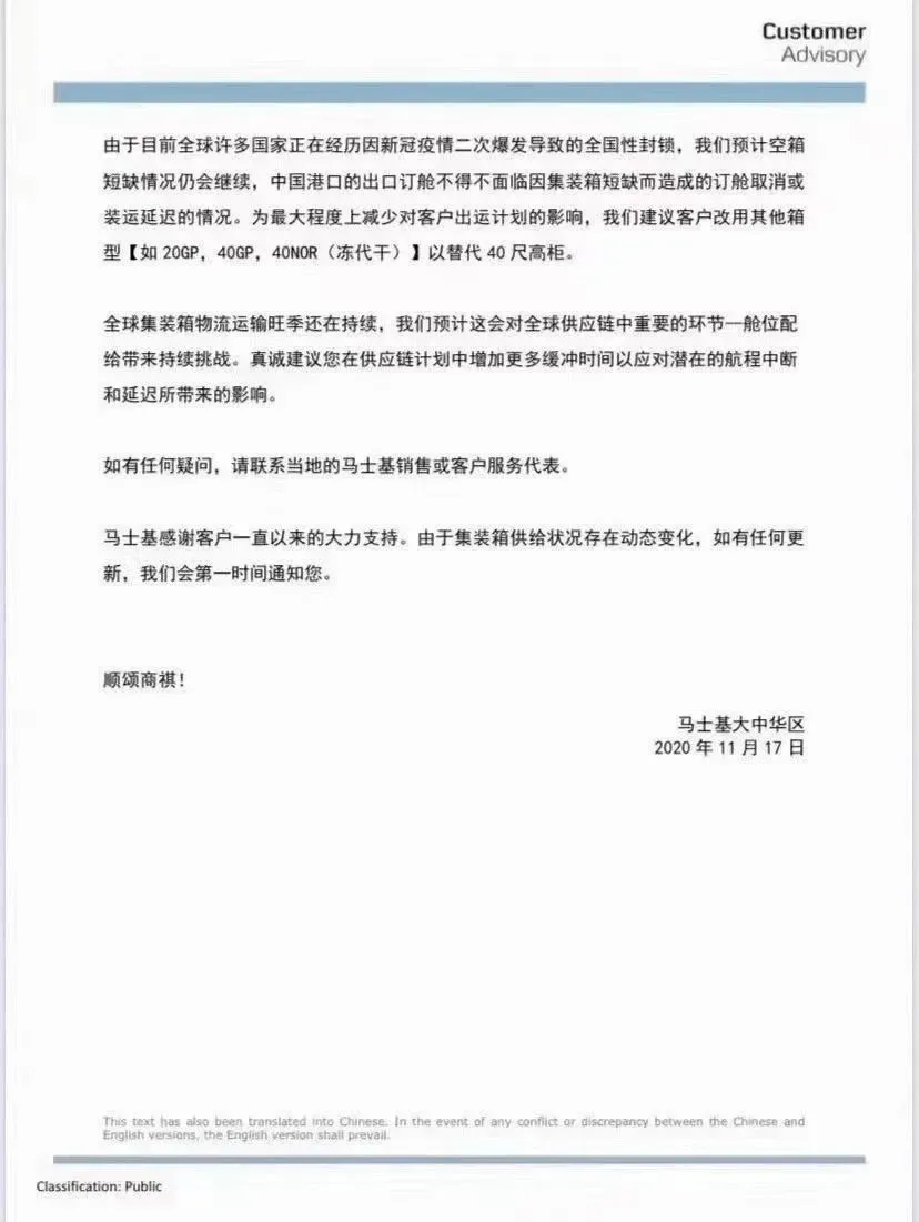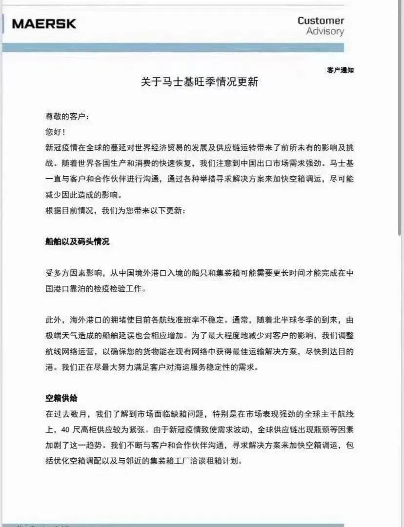 近期,盐田至阿尔赫西拉斯的运价已高达10000USD,马士基发言人表示:“7月至10月间,已将所有能找到的集装箱全部出租了,但是租赁市场已经‘干涸’,市场上没有空箱了。”上海、宁波、青岛、依然缺箱少柜,货代货主正经历着,南美4000、美东5000、东南亚一夜暴涨1000的的高昂运价,而且还没舱位、没柜子。今年这场疫情对船公司以及货代、外贸人都带来了不同的沉重打击。马士基17日也发声了,表示针对此现象,要恢复往日正常的运输状态还需要很长的一段时间。