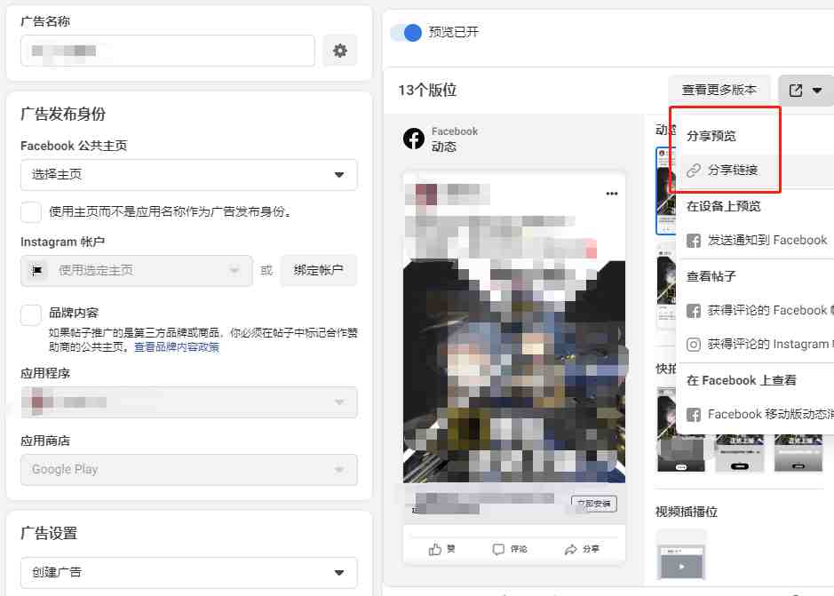 广告主现在可以生成一个链接,以与拥有FB账户的任何人共享其广告草稿(发布之前),并且可以将广告草稿注入其FB新闻Feed和IG Feed中,以获得更准确的预览在不同的版位,广告的具体样子。