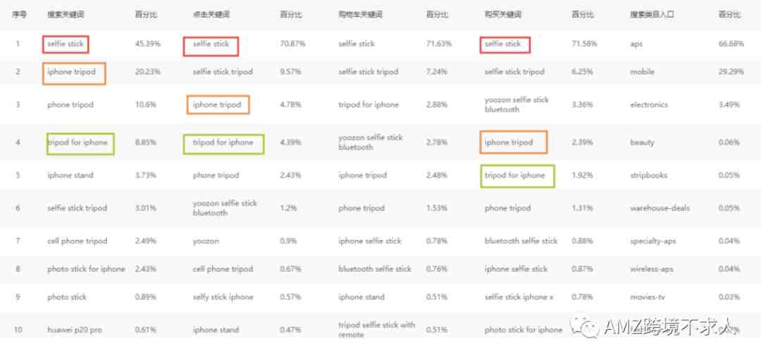 对比比较在点击关键词,搜索关键词,购买关键词都有比较不错排名的关键词,如 selfe stick iphone tripodtripod for iphone。
