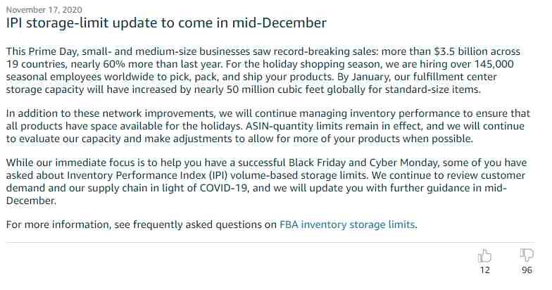 此次公告放出的大消息是,亚马逊将重新评估在美国疫情最新情况下的配送链运力以及买家消费需求,然后会在12月中旬针对IPI仓储限制发布新的指导政策。