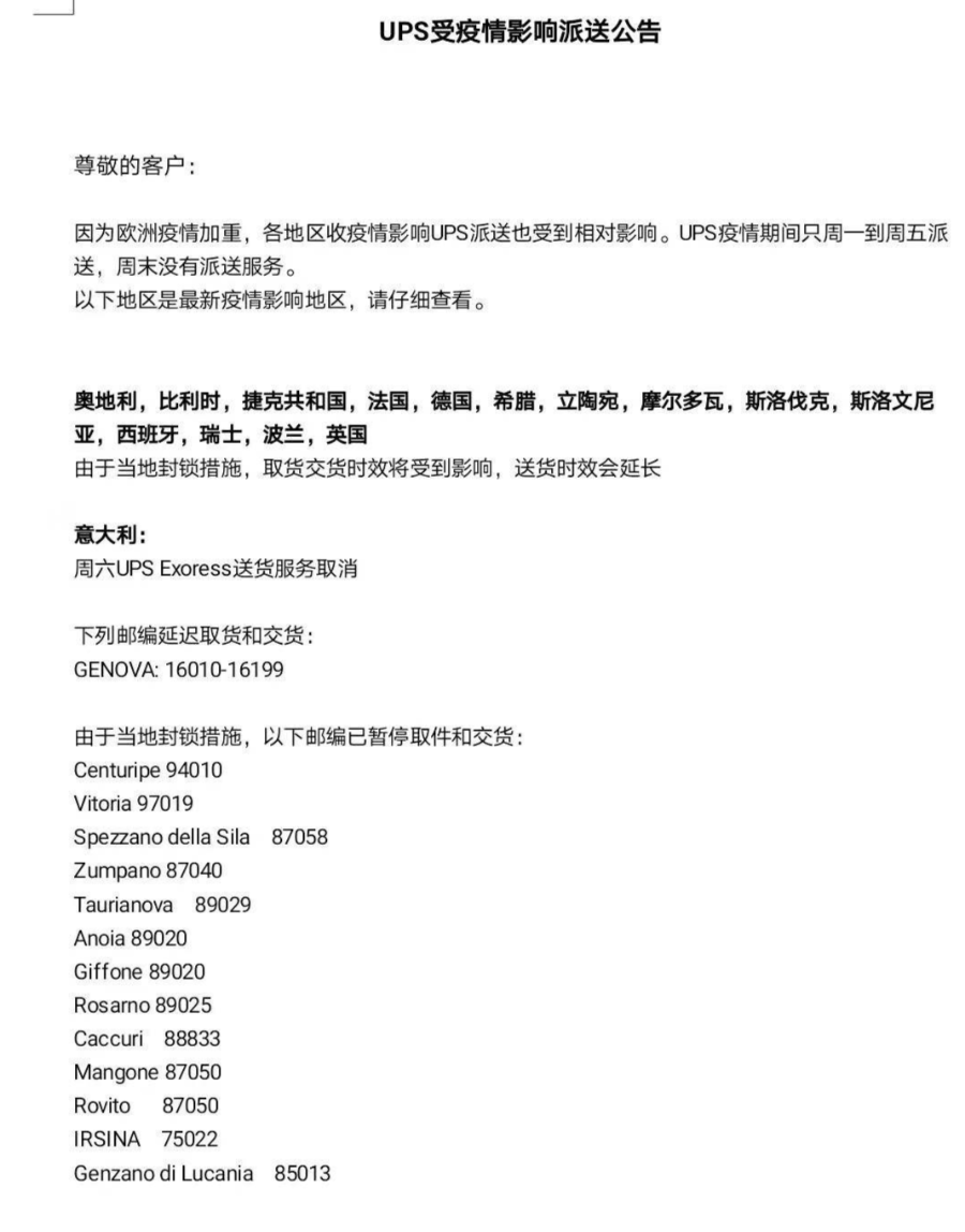 当前,欧洲各国正面临新冠肺炎疫情的第二波冲击,日新增患者数量连创纪录,各国卫生系统面临巨大压力,纷纷出台更加严格的防疫隔离措施,因为欧洲疫情加重,各地区收疫情影响UPS派送也受到相对影响。UPS疫情期间只周一到周五派送,周末没有派送服务。 以下地区是最新疫情影响地区,请仔细查看: 奥地利,比利时,捷克共和国,法国,德国,希腊,立陶宛,摩尔多瓦,斯洛伐克,斯洛文尼亚,西班牙,瑞士,波兰,英国。 由于当地封锁措施,取货交货时效将受到影响,送货时效会延长。 意大利: 周六 UPS Exoress送货服务取消 下列邮编延迟取货和交货: GENOVA:16010-16199 由于当地封锁措施,以下邮编已暂停取件和交货: Centuripe 94010 Vitoria 97019 Spezzano della sila 87058 Zumpano 87040 Taurianova 89029 Anoia 89020 Rosarno 89025 Caccuri 88833 Mangone 87050 Rovito 87050 IRSINA 75022 Genzano di lucania 85013