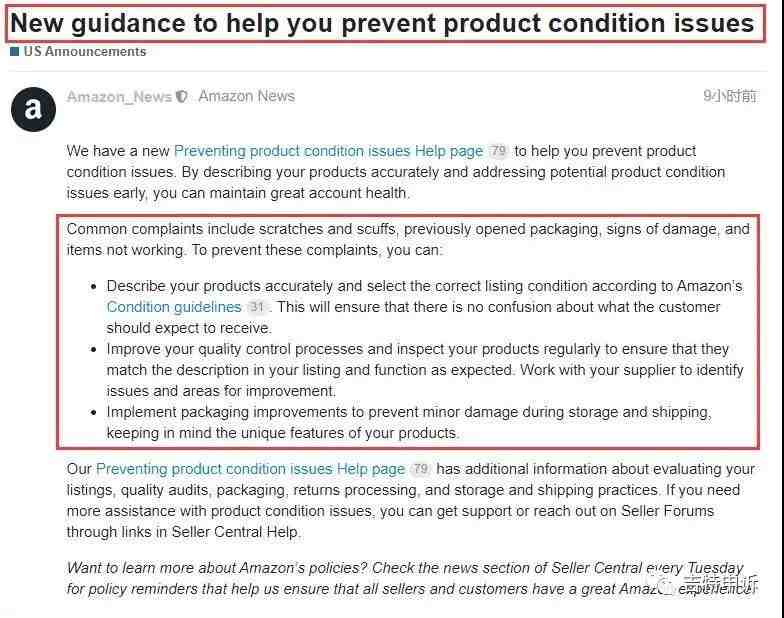 11月11日,亚马逊美国站发布一则有关新指南的公告,亚马逊希望通过这个新指南帮助卖家避免产品状况问题。