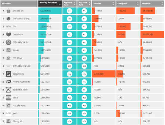 数据显示,销售3C和电子产品为主的Thế Giới Di Động排在第二,月访问量达2900万。