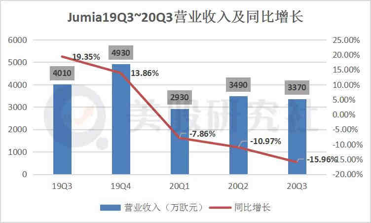 今年受疫情利好起飞的电商平台不在少数,Jumia却是个例外。不同于其他电商平台用户激增带动营收增长,Jumia的营收同比自今年起已经连续三个季度明显下滑,究其原因,美股研究社认为要结合Jumia的营收组成与结构来看。