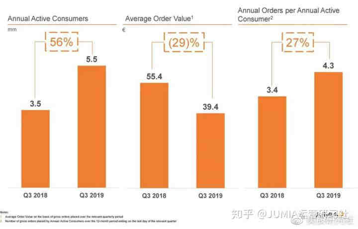 根据Jumia运营研习社披露的数据,Jumia平台的订单均价降低29%,由过去的均价55.4欧元,降低至39.4欧元。这意味着更多低价品类以及低价产品得到快速的发展,在总订单量同比增长幅度不大甚至略微下滑的情况下,总成交金额就下降得比较快,导致第三季度下跌了46%之多。