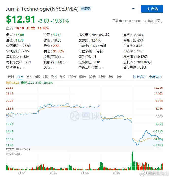 财报数据显示,营收同比再度下滑,平台三大KPI订单量、年度活跃消费者、GMV较上一季度均有不同程度的下降,其中GMV(总成交金额)同比下降28%。财报发布后,10日盘前Jumia股价暴跌超19%,盘后受辉瑞疫苗消息影响股价回升1.7%。截至美股研究社发稿,Jumia每股报12.91美元,总市值为10.12亿美元。