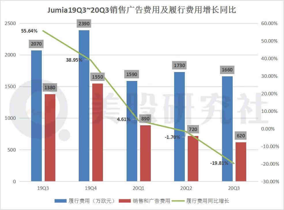 毛利润的增长与成本支出得到控制有很大的关系。近几个季度,Jumia的履行费用销售和广告费用这两项支出同比下滑显著,美股研究社认为除了受疫情利好之外,Jumia在配送服务方面作出的努力也不容忽视。