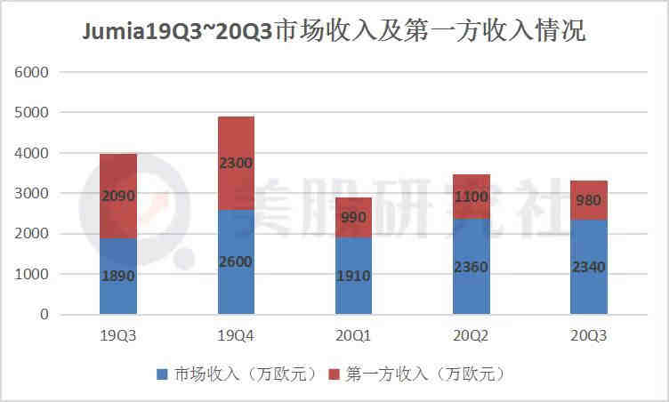 Jumia主要的收入来源分别是市场收入和第一方收入,市场收入即向买家卖家收取的服务费、广告费等,第一方收入即自营收入。