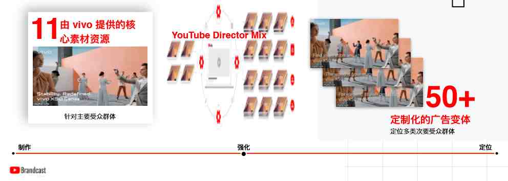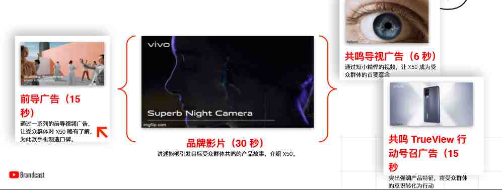 同时 YouTube 也设计了多种视频广告形式,这些形式依次分别对应的目标是:让目标客户认识品牌、了解品牌、采取购买行动,循序渐进地让目标客户接受 vivo X50。