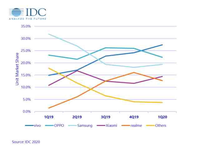 vivo 把海外业务重心放到了新兴市场,vivo 海外最大的市场是东南亚市场,今年 vivo 手机也在东南亚市场增长迅速。以印尼为例,根据 IDC 在今年 5 月下旬发布的《2020 年 Q1 季度印度尼西亚手机市场的报告》显示,2020 年 Q1 印尼智能手机的出货量整体同比下降了 7.3 %,但是 vivo 的销量却突破性增长,成为这一季度中印尼销量最高的手机品牌。